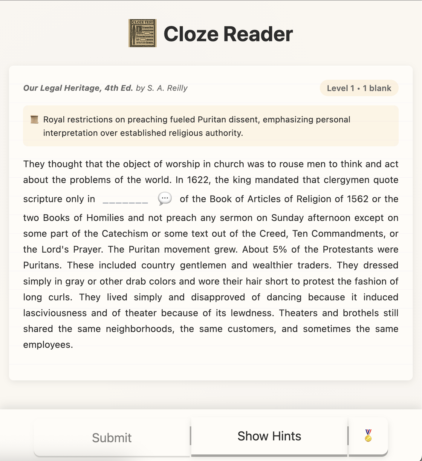 Figure 1. Cloze Reader in use. The interface presents a passage from Our Legal Heritage, 4th Ed. by S. A. Reilly at Level 1 with one blank. The blank falls inside a discussion of royal preaching restrictions and Puritan dissent, and the hint panel remains available.